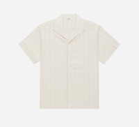 Our Leisure Shirt is modeled after vintage 1950's open-collar vacation shirts. This iteration utilizes a Japanese striped lace weave with a beautiful texture. The shirt is finished with mother of pearl buttons. Details - 100% Cotton woven in Japan - Pattern-matched straight back yoke - Open spread Collar - Mother of pearl buttons - Made in India