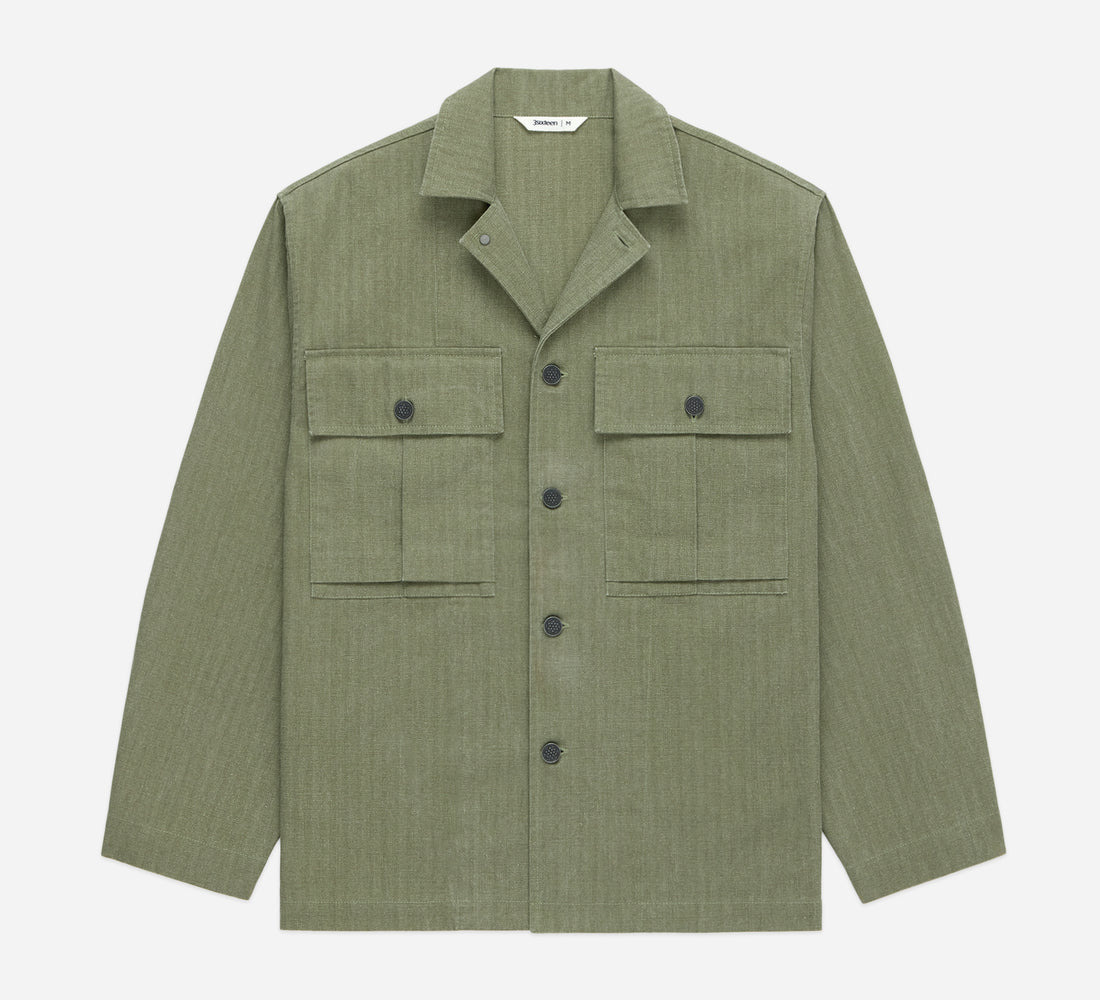 The M43 Overshirt is a modernized WWII silhouette that works well as a midlayer in colder months or as a jacket when it's warmer. It features a generous armhole and sleeve with button adjustment, two large pleated chest pockets, and replica 13-star shanks. The fabric is a beautiful pigment-dyed cotton that has a washed-out and faded look that is true to the vintage garments it references. Details - 100% Cotton pigment-dyed fabric - Relaxed fit - Two oversized chest pockets - Custom 13-star pewter shank buttons - Made in India