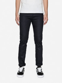 The NT-120x is a midweight raw indigo/black selvedge jean with a high rise and slightly roomier thighs, coupled with our smallest leg opening. This style utilizes our flagship 14.5 oz shadow selvedge denim (120x) which is woven exclusively for us by Kuroki Mills and will fade to a high contrast blue with wear. Additional details include custom gunmetal YKK hardware and a roughout leather patch. All our jeans feature super heavyweight 8oz cotton twill pocketing that is almost twice the weight of traditional pocketbags. Made in USA. Details - 14.5oz raw indigo warp/black weft selvedge woven in Okayama, Japan - Custom gunmetal shanks and rivets - Selvedge fly and coin pocket detailing - Heavyweight leather patch by Tanner Goods - 8oz heavy cotton twill pocketing - Made in USA