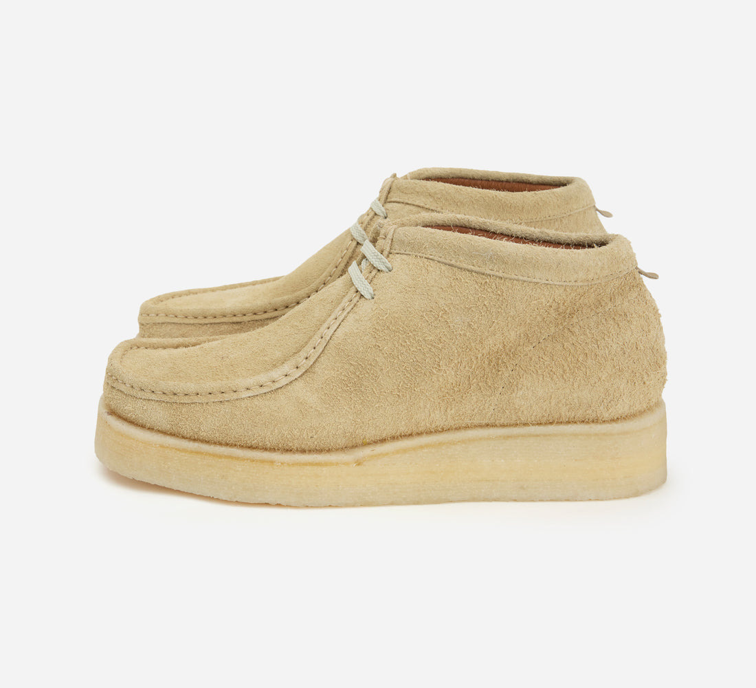 Our partnership with Padmore & Barnes, the original manufacturer of the P404 Boot (commonly known as the Wallabee) has yielded core styles that we are proud to stock. Our P404 Boot is crafted of a shaggy Italian suede with a nappy, textured hand that’s a noticeable departure from the classically smooth suede usually employed. Each shoe gets a tonal double stacked crepe sole and is finished with a simple tab on the back with our debossed logo. Made in Portugal. SIZING: Padmore & Barnes uses UK sizing - we recommend taking 1-1.5 down from your typical US sneaker size. Please note that the P404 is a wider F last, which might result in your correct size feeling roomier than what you're used to at first. When trying this shoe on, make sure there is no heel slippage and that the length of the shoe is correct to ensure you're in the right size. !details! Details - P404 Boot style - Italian suede upper - Double-stacked crepe sole - Handstitched moc toe - Leather lined - Made in Portugal