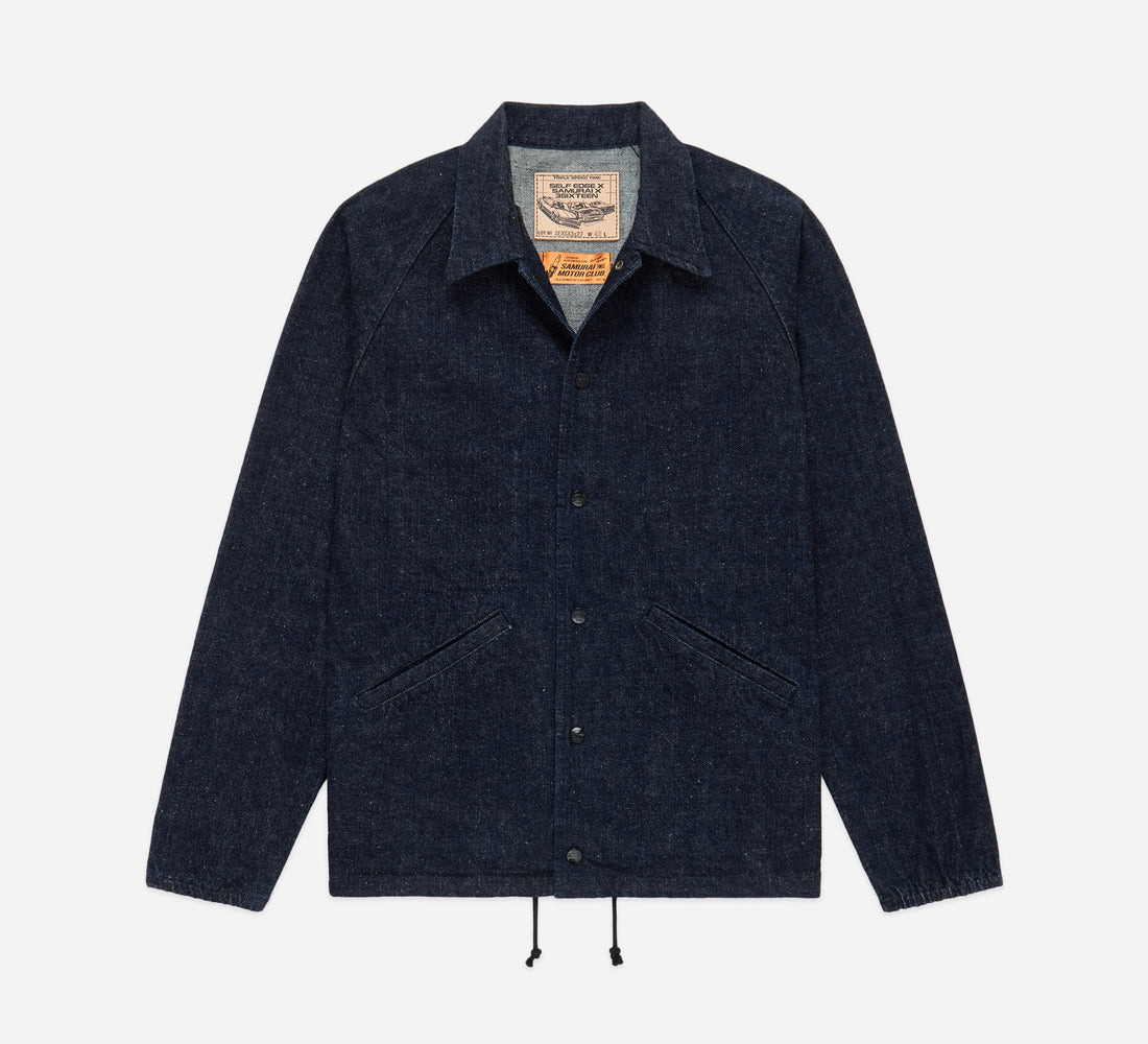 We've joined forces with storied Japanese brand Samurai and world renowned denim purveyor Self Edge to create a triple-branded JDM car themed capsule collection. We started by developing a 15 oz custom denim for the project, with a mid-loose tension, woven using medium staple warp yarns from Texas and short staple weft yarns from Greece, Australia and the US. The warp yarns were rope dyed to the deepest possible color using a mix of natural and synthetic indigo. For the selvedge ID, we designed something that we had never seen before, a charcoal dyed border with black and silver lame thread for the ticker. This unique piece of outerwear is cut with a slightly elongated body, raglan sleeves, and elastic wrist cuffs and is finished with a cotton drawstring cord and black enamel Samurai branded snaps. The unsanforized jacket is rinsed to remove shrinkage and jumpstart the break in process. Details - 15 oz custom woven unsanforized denim - Charcoal & silver lame thread selvedge ID - Medium staple warp yarns 100% from Texas - Short staple weft yarns from Greece/Australia/USA - Rope dyed with a mix of Natural and Synthetic Indigo - Black Samurai snap buttons - Made in Japan