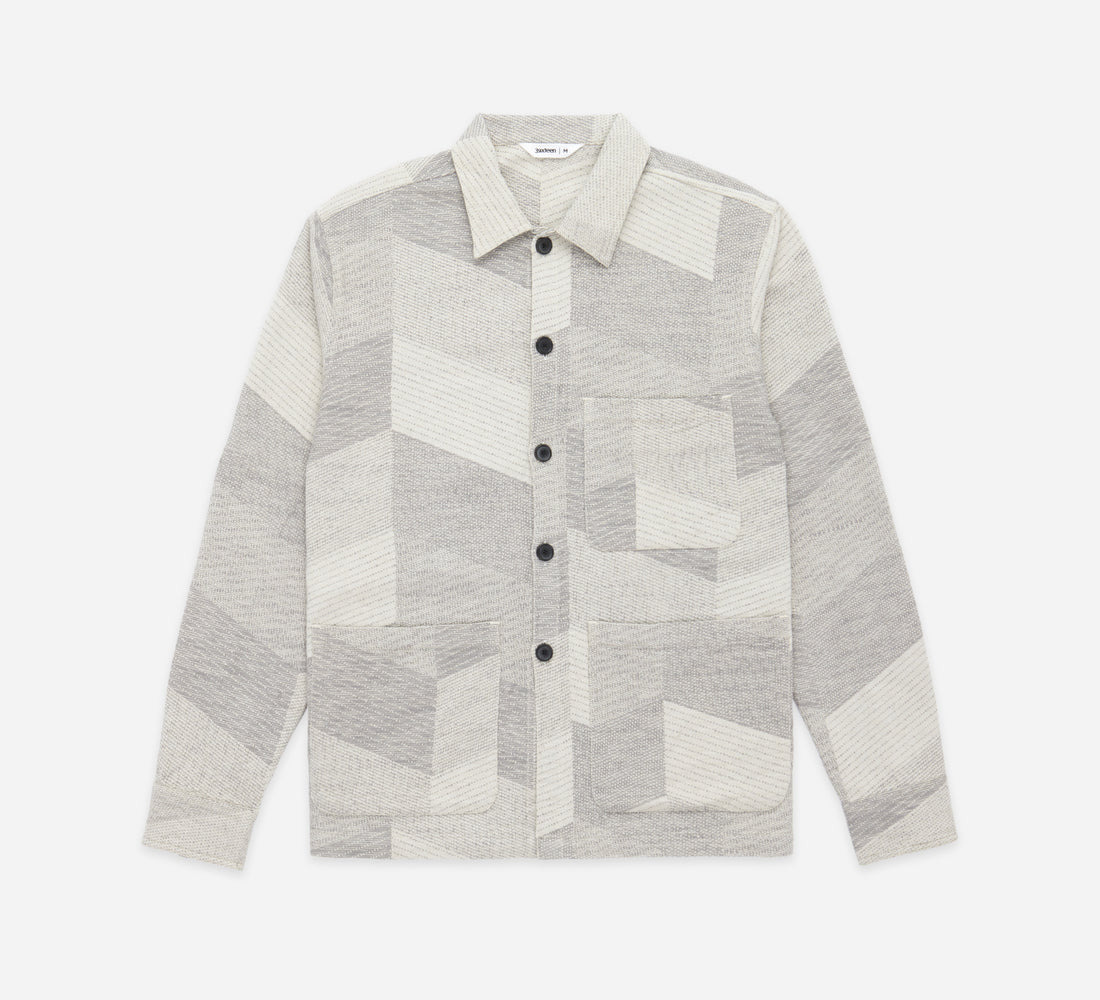 The Shop Jacket is designed with a nod towards classic European chore coats. For SS23, we've paired it with a custom woven jacquard fabric with a textured zig-zag pattern woven in. Horn buttons finish the jacket off. Made in India. PLEASE NOTE: Sale items are final sale and are not eligible for returns. Details - 100% cotton fabric - Straight bottom hem - 3 pocket front - Horn buttons - Made in India