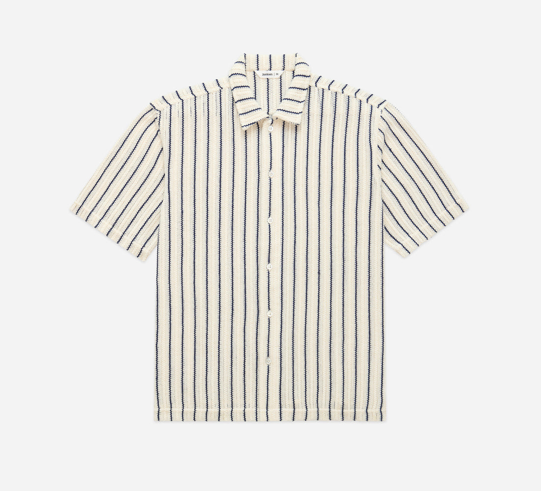 The Short Sleeve Work Shirt is a modern take on traditional work shirts. This iteration uses a breathable yet hefty mesh weave fabric with a navy stripe running throughout. The fabric has a handfeel similar to a crochet weave but with much more structure. The shirt is rounded out with vintage workwear-inspired corozo buttons. Details - 100% cotton fabric - Corozo buttons - Made in India