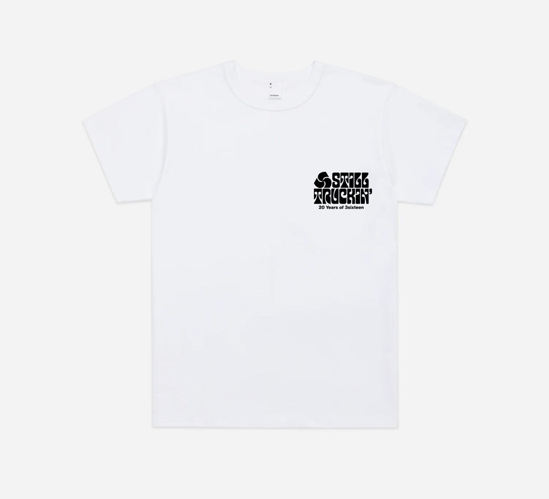 Our 20yr anniversary graphic tees were designed for us by our friend Jordan Butcher of Strange Practice. The Still Truckin' graphic is a take on a 1970's era graphic. The tees feature a 260 gsm combed cotton jersey that's custom knit for us in Canada, and then cut and sewn in San Francisco, CA in the same factory where our jeans are made. The tees have a triple needle coverstitched "Never Sag" collar that stays tight around the neck over extended wears. Made in USA. Note:These tees are now constructed using mill-laundered jersey and shrinkage is minimal. Please check the updated measurement chart to determine your sizing. Details - 260 gsm jersey fabric custom knit in Canada - Triple needle coverstitched collar - Made in USA
