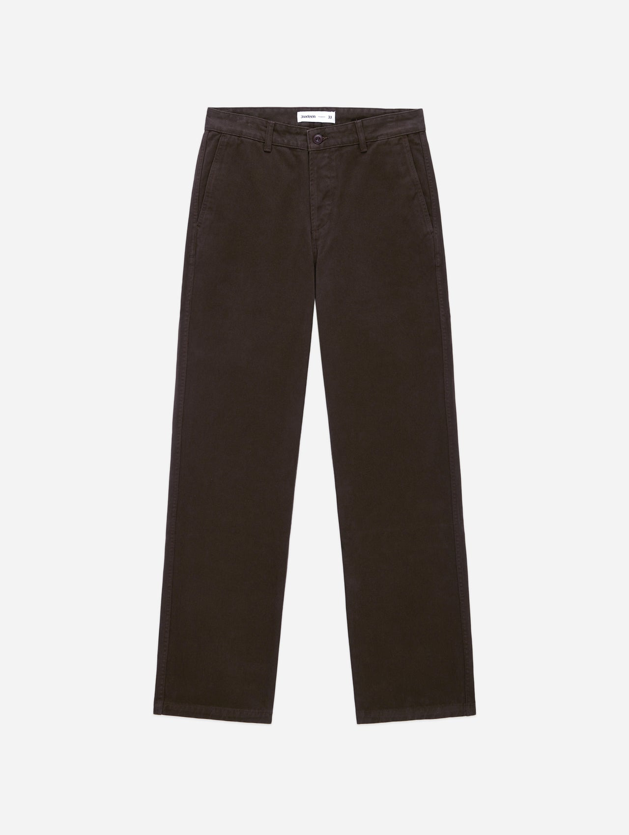 The Work Pant features a wide leg fit and high rise reminiscent of classic work pants. We chose a heavyweight chino fabric with a pronounced twill weave that is structured yet drapes well. After sewing, the pants are garment dyed and rinsed for a broken in feel. The pant is finished with double needle flat fell seams throughout for extra durability and tonal dyed corozo buttons. Details - 100% cotton - Corozo buttons - Rear welt pockets - Made in Portugal