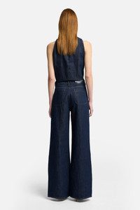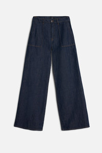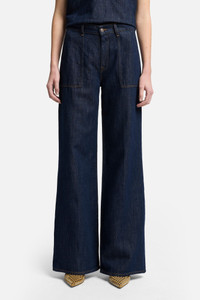 Fits like: A high-rise wide-leg fit with a full-length silhouette and utility-inspired pocket details. Feels like: A structured yet breathable cotton blend with just enough stretch for all-day comfort. The Details: - Dark indigo wash - Utility-style side and back pockets - Button and zip closure MEASUREMENTS - Based on size 27 - Rise: 10.75" - Approx Inseam: 34" - Leg Opening: 24.25" - Measurements may vary based on size, fabric, and wash. FABRIC & CARE - 93% Cotton, 5% Polyester, 2% Elastane - Machine wash cold inside out with like colors, lay flat to dry - Imported