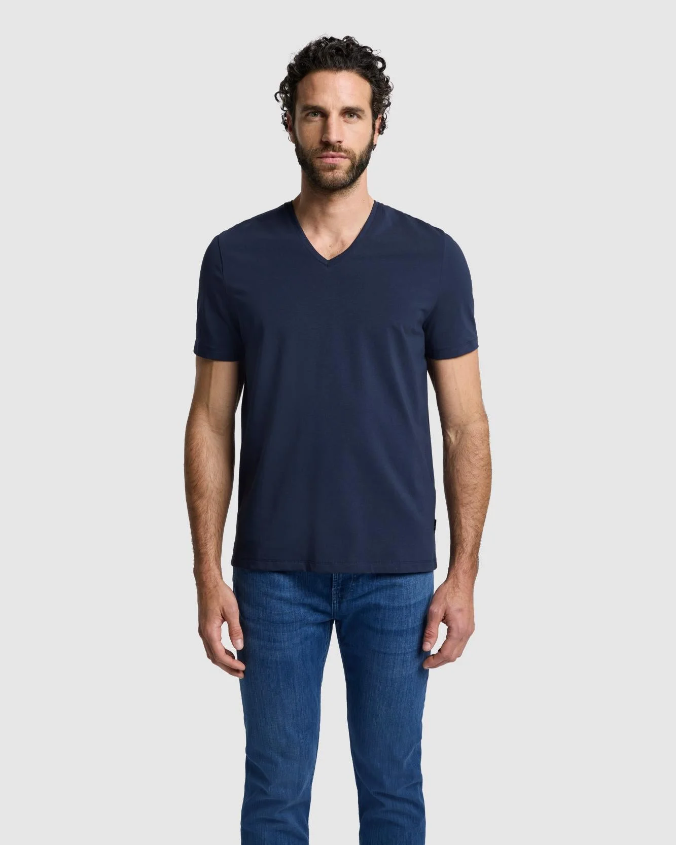 Fits like: The perfect T-shirt - not too fitted, not too relaxed. Feels like: Lightweight breathable cotton with a soft touch and comfortable stretch. The Details: - Navy blue shade - V-neck - Short Sleeve - Easy T-shirt silhouette MEASUREMENTS - Based on size Medium - Length: 28" - Chest: 42.5" - Sweep: 41.75" - Measurements may vary based on size, fabric, and wash. FABRIC & CARE - 91% Cotton, 9% Elastane - Machine wash cold inside out with like colors, lay flat to dry - Imported