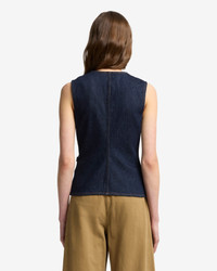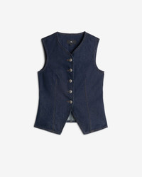 Fits like: A fitted vneck vest that contours to the body, offering a flattering silhouette with a sleek, modern tailored vibe Feels like: Rigid denim that holds its shape while evolving into a softer, more lived-in fit over time. The Details: - Rigid - Sleeveless - Dark wash denim - Seam details - Front button closure - Silver domed buttons FABRIC & CARE - 99% Cotton, 1% Elastane - Machine wash cold inside out with like colors, lay flat to dry - Imported