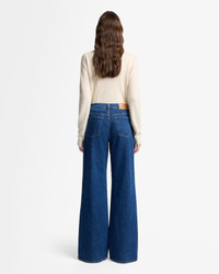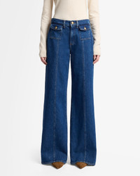 Fits like: A high rise fit that contours the waist and hips before falling into an easy, full-length wide leg. Feels like: A grounded, structured denim that develops softness and character with every wear. The Details: - Mid Wash - Front seam detail - Statement flap pockets with gold hardware - Zip fly with button closure - Clean back pocket MEASUREMENTS - Based on size: 27 - Rise: 10.75" - Leg Opening: 24.25" - Approx. Inseam: 34" - Measurements may vary based on size, fabric, and wash. FABRIC & CARE - 99% Cotton, 1% Elastane - Machine wash cold inside out with like colors, lay flat to dry - Imported
