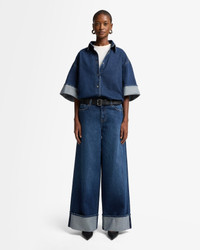 Fits like: An oversized fit with a relaxed drape through the body, accentuated by wide cuffed sleeves for a subtle statement shape. Feels like: Rigid denim that holds its shape while evolving into a softer, more lived-in fit over time. The Details: - Dark Indigo Wash - Wide cuff sleeves - Short sleeves - - Point collar - Front button closure FABRIC & CARE - 99% Cotton, 1% Elastane - Machine wash cold inside out with like colors, lay flat to dry - Imported
