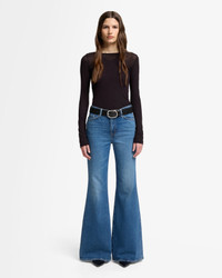 Fits like: A high rise fit that hugs through the hips and thighs before breaking into a bold, full-length flare for a vintage-inspired silhouette. Feels like: Rigid denim that holds its shape while evolving into a softer, more lived-in fit over time. The Details: - Medium Indigo Wash - Zip fly with button closure MEASUREMENTS - Based on size: 27 - Rise: 10.75" - Leg Opening: 27.5" - Approx. Inseam: 34" - Measurements may vary based on size, fabric and wash FABRIC & CARE - 99% Cotton, 1% Elastane - Machine wash cold inside out with like colors, lay flat to dry - Imported