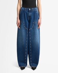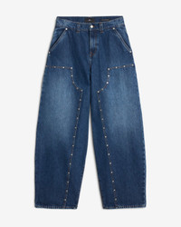Fits like: A roomy, high rise silhouette with an exaggerated curvilinear shape with a relaxed drop crotch that flows from hip to hem for a perfectly undone, relaxed look. Feels like: Rigid denim that holds its shape while evolving into a softer, more lived-in fit over time. The Details: - Dark Indigo Wash - Carpenter details - Exaggerated barrel leg baggy jean - Zip fly with button closure - Silver hardware accents along the legs - Clean back pockets - Heavy whiskering and fading along the hips and thigh MEASUREMENTS - Based on size: 27 - Rise: 12.62" - Leg Opening: 21" - Approx. Inseam: 32" - Measurements may vary based on size, fabric, and wash. FABRIC & CARE - 100% Cotton - Machine wash cold inside out with like colors, lay flat to dry - Imported