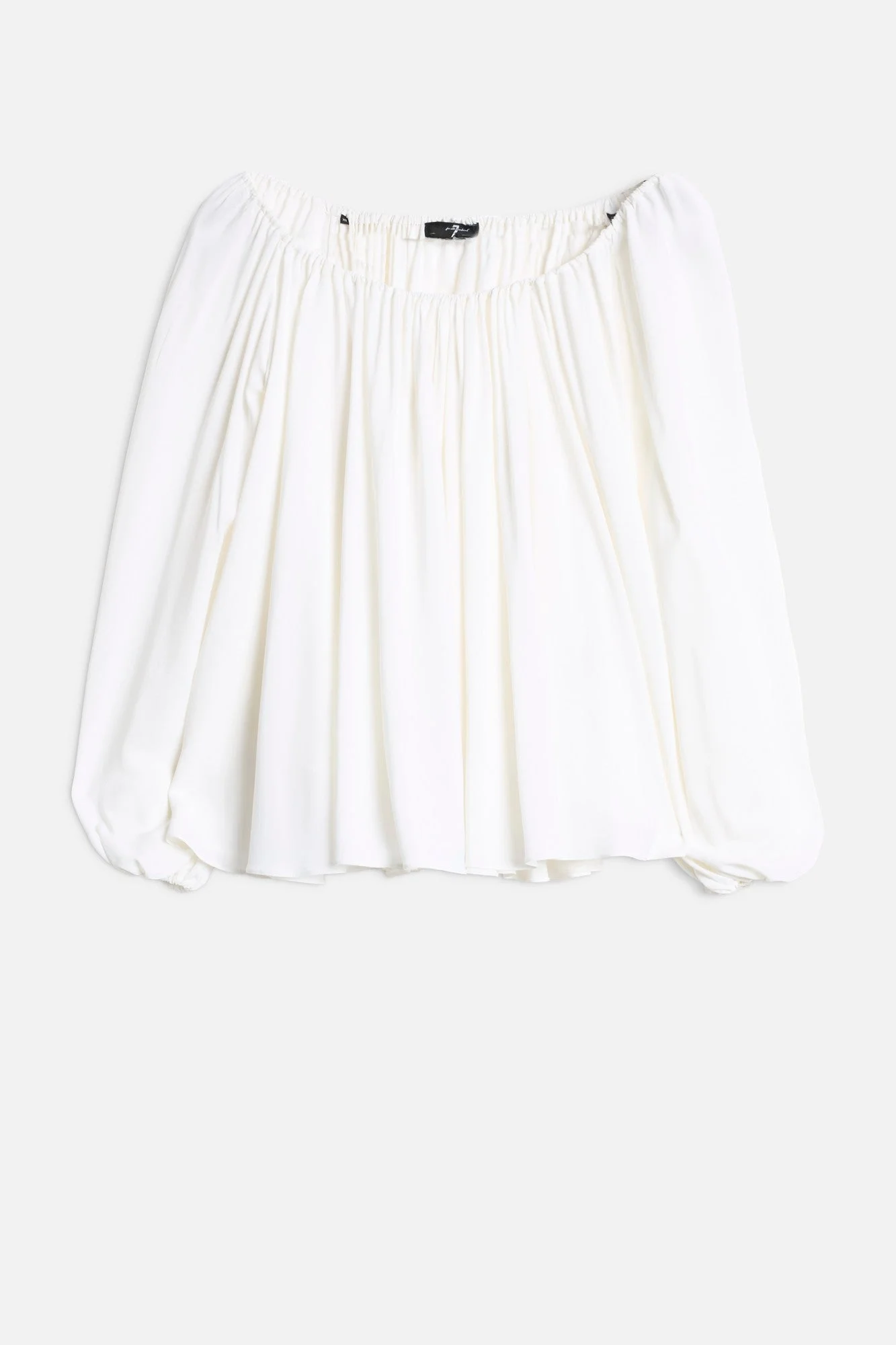 Fits like:A soft cloud-weightless, free, effortlessly undone. Feels like:Luxuriously smooth, with a delicate sheen that catches the light, blending comfort with quiet opulence. The Details: - White - 100% Silk - Draped off-shoulder neckline with gathered elastic - Voluminous sleeves with ruched cuffs