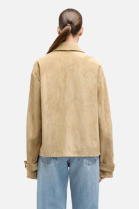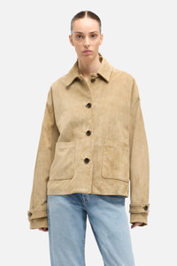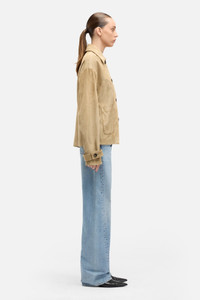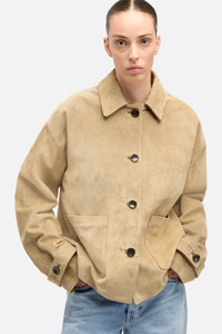 Fits like: Boxy through the body with a softly cropped hem, and relaxed shoulder for easy layering. Feels like: Luxurious 100% leather suede with a thick, durable structure and a soft, velvety texture. The Details: - Warm khaki - 100% Leather - Oversized patch pockets - Classic point collar - Button front closure - Button cuffs with adjustable tab detailing FABRIC & CARE - 100% Leather - Professional Leather Cleaning Only - Imported