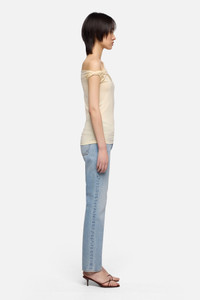 Fits like:Sleek and sculpted, with a hint of asymmetry. Designed to sit close to the body with a modern, off-shoulder drape. Feels like:Silky-soft and lightweight, crafted from lyocell for a smooth, breathable, and eco-friendly feel. The Details: - Buttermilk - Asymmetric neckline with twisted shoulder detail - Cap sleeve on one side, open shoulder on the other - Clean finish hems