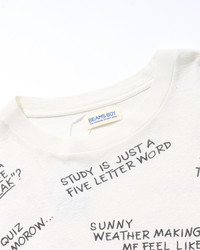 BEAMS BOY message printed T-shirt BEAMS BOY의 스테디셀러 메세지 프린트 T셔츠입니다. 브랜드다운 위트를 더한 티셔츠로, 공부량이 매우 많기은 미국 대학에 재학중인 학생이 투덜대며 중얼거릴 것 같은 말을 상상해 프린트로 넣은 제품입니다. 뒷면에는 학생의 행복한 순간을 이미지화하여 표리부동한 말을 프린트했습니다. 사이즈 어깨 너비, 품 모두 넉넉한 사이즈입니다. 기장은 힙에 걸릴 정도여서 전체적으로 루즈한 분위기입니다. 약간의 사용감이 존재합니다. ONE SIZE : 어깨 54 / 가슴 53 / 소매 19 / 총장 71
