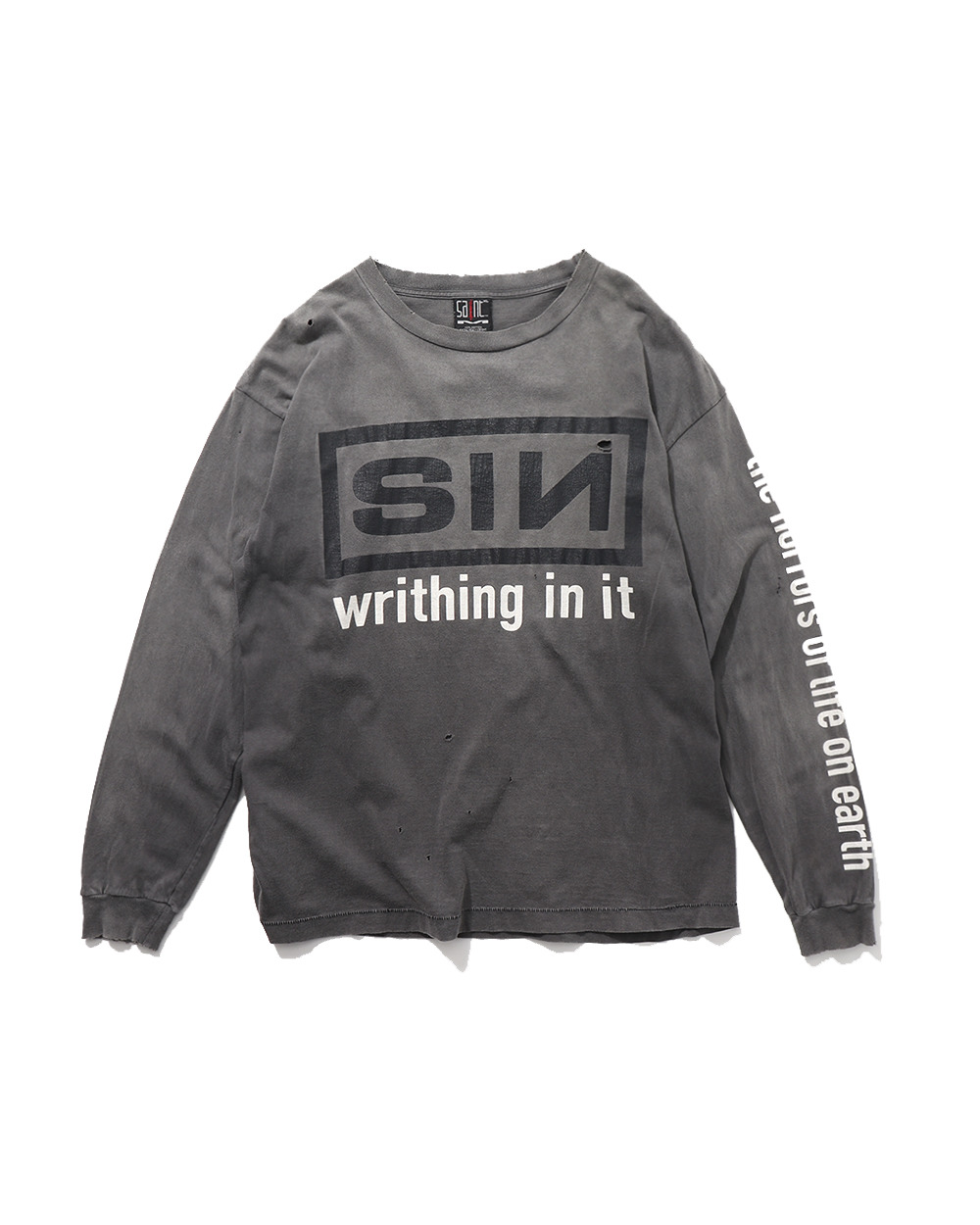 SAINT MICHAEL의 Nine Inch Nails Long Sleeve T-shirt입니다. NIN 패러디 제품으로 희소성 높은 제품입니다. 임팩트 있는 프린팅이 인상적인 티셔츠로 좋은 컨디션 유지중입니다. 약간의 사용감 존재합니다 XL : 어깨 61 / 가슴 63 / 소매 64 / 총장 77