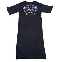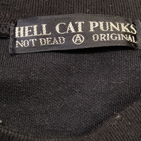 Designer: HELL CAT PUNKS (HCP) is a well-known Japanese brand established in Harajuku, Tokyo. They specialize in punk, goth, rock, and alternative street fashion. Their aesthetic often includes bold graphics, subversive imagery (like crosses, pentagrams, and the number 666), and unique design details, appealing strongly to the Harajuku fashion and Goth Core subcultures. The tag detail "HELL CAT PUNKS NOT DEAD ORIGINAL" confirms its heritage within this alternative Japanese fashion scene. • Style & Era: The garment has a distinct late 1990s to early 2000s (Y2K) alternative street style. It combines a simple, long silhouette with provocative graphics ("UNDER THE ROSE," crosses, pentagram, "666," blue roses, spiderwebs) and a major functional/decorative element: the prominent full-length white zipper down the side. 📝 Product Description Rare Vintage HELL CAT PUNKS Goth Core Maxi T-Shirt Dress Embrace the bold aesthetics of Japanese street fashion with this striking vintage maxi dress from HELL CAT PUNKS. This piece is a quintessential example of Harajuku punk/goth style, featuring a sleek, black, ankle-length t-shirt dress silhouette punctuated by an incredible back graphic and a dramatic side detail. The back is adorned with the eye-catching "UNDER THE ROSE" graphic: • Two crossed rose stems with striking blue-outlined roses • Subversive symbols including a pentagram, three crosses, and "666" • Spiderwebs and smaller rose details The front is minimalist, featuring a full-length, functional white zipper running from the underarm seam all the way to the hem, allowing for versatile styling (wear it slightly open for a slit or fully closed). The dress is constructed from a soft, comfortable fabric, typical of these relaxed, alternative styles. Key Features: • Brand: HELL CAT PUNKS - "NOT DEAD ORIGINAL" • Style: Maxi T-Shirt Dress / Tunic • Details: Full-length white zipper on the front/side seam. Back graphic. • Aesthetic: Goth, Punk, Alternative, Harajuku, Y2K Streetwear.