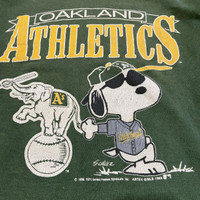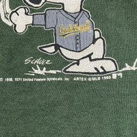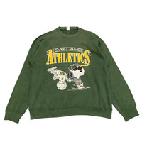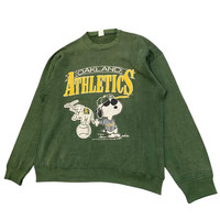 About the Designer/Manufacturer Artex Manufacturing Company was a prominent American apparel brand throughout the 1970s and 80s, known primarily for its high-quality licensed sportswear and collegiate gear. They held significant licensing agreements with both MLB and United Feature Syndicate (Peanuts), making their "Snoopy sports" line a staple of 80s fashion. Their garments are prized today for their "Made in USA" durability and the characteristic "boxy" vintage fit. Description Vintage 1989 Oakland Athletics x Peanuts "Joe Cool" Snoopy Sweatshirt Own a piece of Bay Area baseball history with this rare 1989 Oakland Athletics crewneck. This was a legendary year for the A's (the year they won the "Battle of the Bay" World Series). The graphic features Snoopy in his "Joe Cool" persona wearing an A's jersey, standing next to the classic Stomper elephant mascot. • Brand: Artex Mfg. Co. • Era: 1989 (Dated on graphic) • Condition: Excellent vintage condition with beautiful natural cracking on the print, giving it an authentic aged look. No major stains or holes visible. • Material: Cotton/Polyester Blend (Heavyweight fleece) • Origin: Made in USA Measurements (Laid Flat) • Pit to Pit (P): 24 inches • Length (L): 26 inches • Shoulder to Shoulder (S): 23.5 inches • Sleeve Length (SL): 21.5 inches • Fits like a modern Large/Extra Large (Boxy Fit). SKU : MIX46