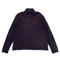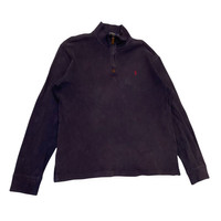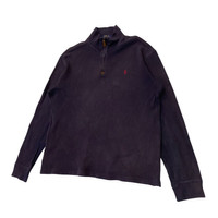 About the Designer Ralph Lauren is the definitive name in American heritage style. Since 1967, the brand has defined the "preppy" look, blending Ivy League sophistication with rugged American athleticism. The Polo line is the heart of the empire, famous for its timeless silhouettes, high-quality cotton fabrics, and the iconic embroidered pony logo—a global symbol of classic, effortless luxury. Description Elevate your layering game with this classic Polo Ralph Lauren Quarter-Zip Pullover. Rendered in a versatile deep navy blue with a contrasting red embroidered pony, this piece features unique faux leather detailing on the zipper pull for a sophisticated touch. Made from 100% premium cotton, it offers a soft, breathable feel perfect for transitional weather or a smart-casual office look. The ribbed cuffs and hem ensure a comfortable, structured fit. • Brand: Polo Ralph Lauren • Style: Quarter-Zip / Mock Neck Pullover • Color: Navy Blue with Red Pony • Material: 100% Cotton (with Faux Leather trim) • Origin: Made in Vietnam • Condition: Great vintage condition with a nice natural fade that adds character. Size & Measurements The tag is labeled as a Medium (175/96A). Please refer to the flat-lay measurements below to ensure a perfect fit: Pit to Pit (P) 23inches Length (L) 27” Shoulder (S) 20” Sleeve Length (SL) 24.5” SKU : MIX47