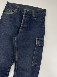 Helmut Lang 1997 Denim Cargo Pants Sz 31 9/10 Condition Waist: 15.5 Inseam: 33.5 Leg Opening: 7 Front Rise: 11 Thigh: 10.5 Knee: 8.5 Measured it by inches Accepting offers No return No exchange Ask before buy