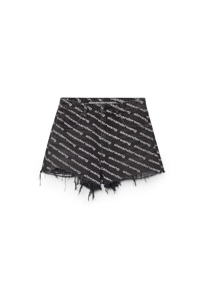 4DC1214896 Classic high-waisted cut-off shorts in grey denim with an aged logo print are introduced in the FW24 collection by Alexander Wang. The shorts are 100% cotton and the back of the waistband is decorated with a leather logo patch.