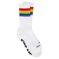 The high white Balenciaga socks made of stretchy ribbed knitwear are decorated with a rainbow flag and 'Kiss Me' and 'Hug Me' prints on the feet. Check out more accessories from the new Balenciaga collection available online. 20% off at check out | Discount until October 12 656520/472B4/9000 Material: 80% cotton 18% polyamide 2% elastane Designed in: France Color: White