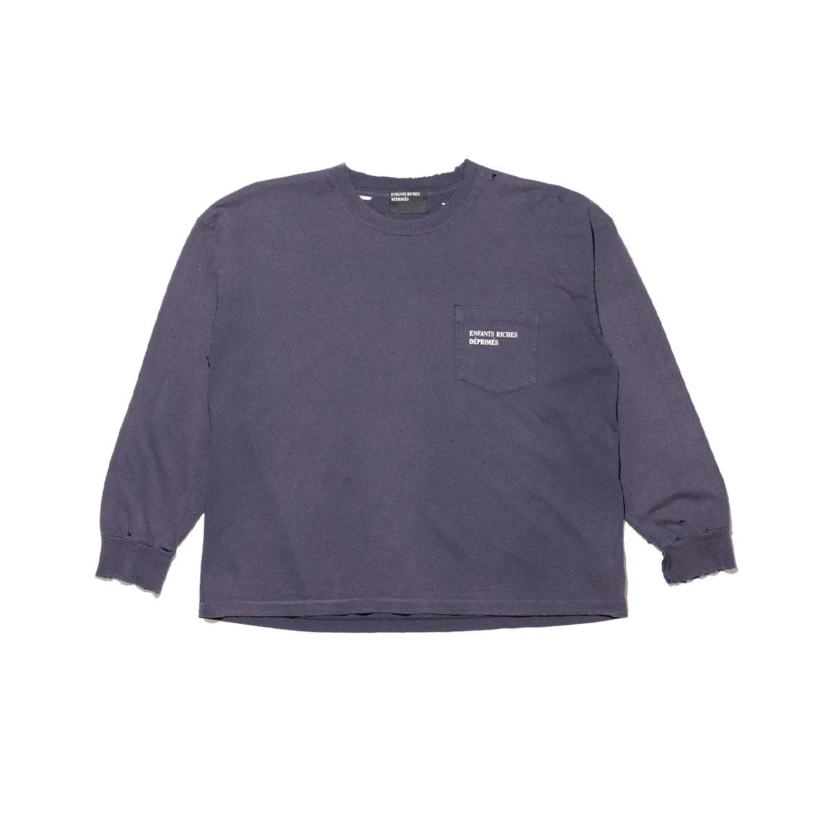 010860 This long-sleeve T-shirt from Enfants Riches Deprime is crafted from heavyweight cotton jersey and features a relaxed, drop-shoulder fit. It embodies the brand's signature blend of elevated minimalism and subversive style, designed with rib-knit detailing at the neckline and cuffs, as well as a single-stitch hem at the waist. Printed artwork at the front and a custom vintage wash finish give it a timeless, authentic look, made in the USA.