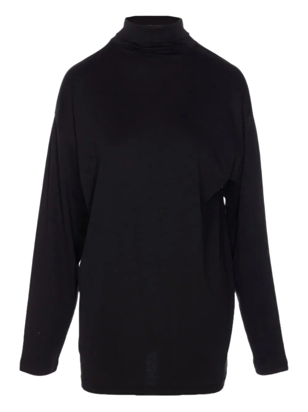 TO1467LJ1043/BK999 The Lemaire Relaxed Mock Neck T-shirt in Black is a refined essential for any modern wardrobe. Crafted in Portugal from a luxurious cotton and silk-blend interlock jersey (80% cotton, 20% silk), it offers a soft, breathable feel with a subtle sheen. The design features a relaxed straight cut, a mock neck, and long sleeves, combining casual elegance with everyday comfort. With its minimalist silhouette and premium fabric, this piece embodies Lemaire's signature understated sophistication.