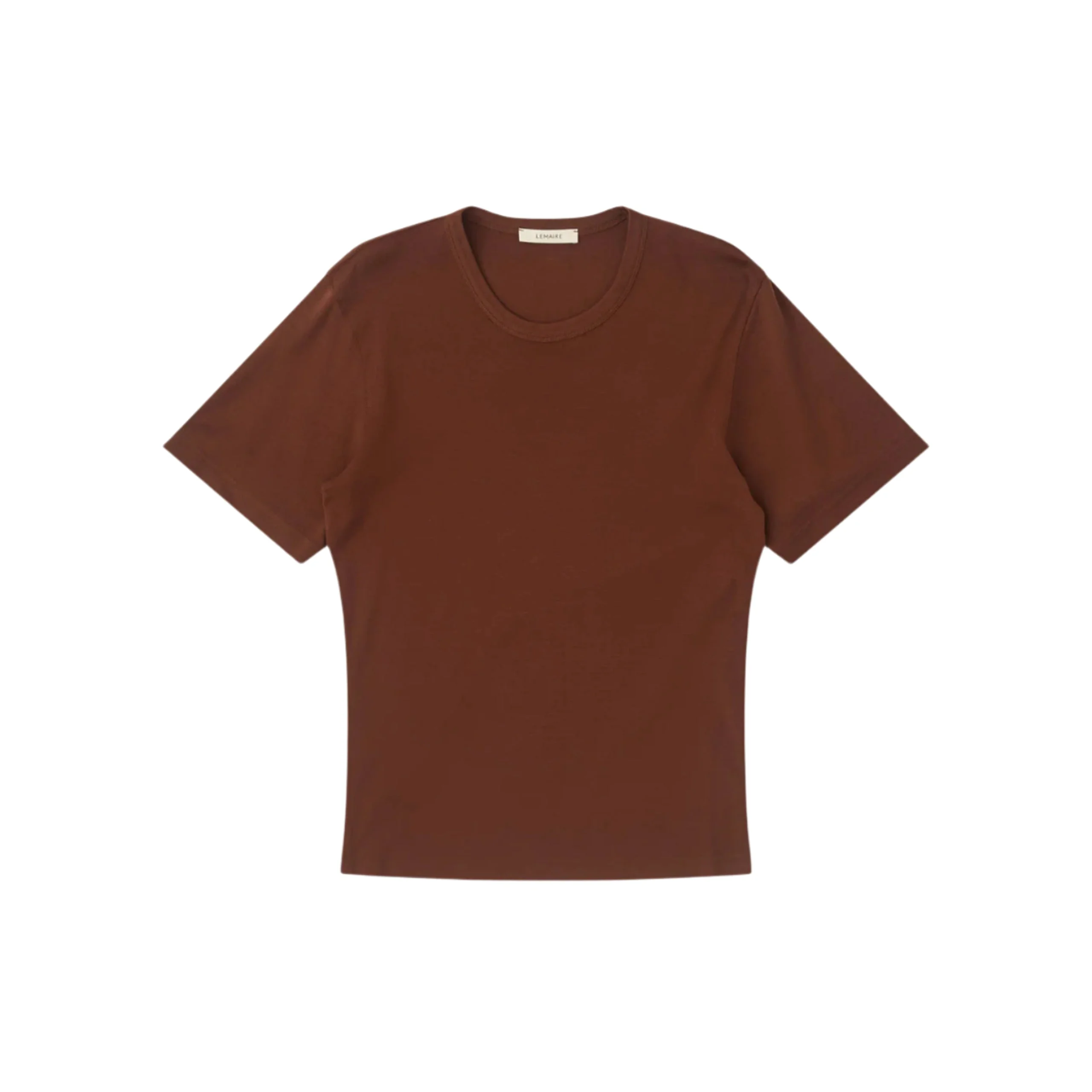 TO1440LJ1016/BR402 The Rib T-shirt in Brunette by Lemaire is a timeless wardrobe essential, crafted from soft, flowing cotton jersey with a textured ribbed knit. Featuring a straight cut and a ribbed crew neck, this short-sleeved tee combines comfort and understated elegance. Made in Portugal from 100% cotton, it offers a perfect blend of quality and simplicity.
