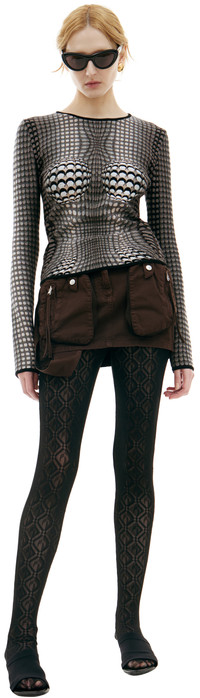 WTK041A/CKNI0514/GR70 Styled with: MARINE SERRE Tights, Blumarine Skirt, Balenciaga Mules Material: 70% viscose 30% polyamide Designed in: France Model is 177 cm and is wearing size M Color: Grey