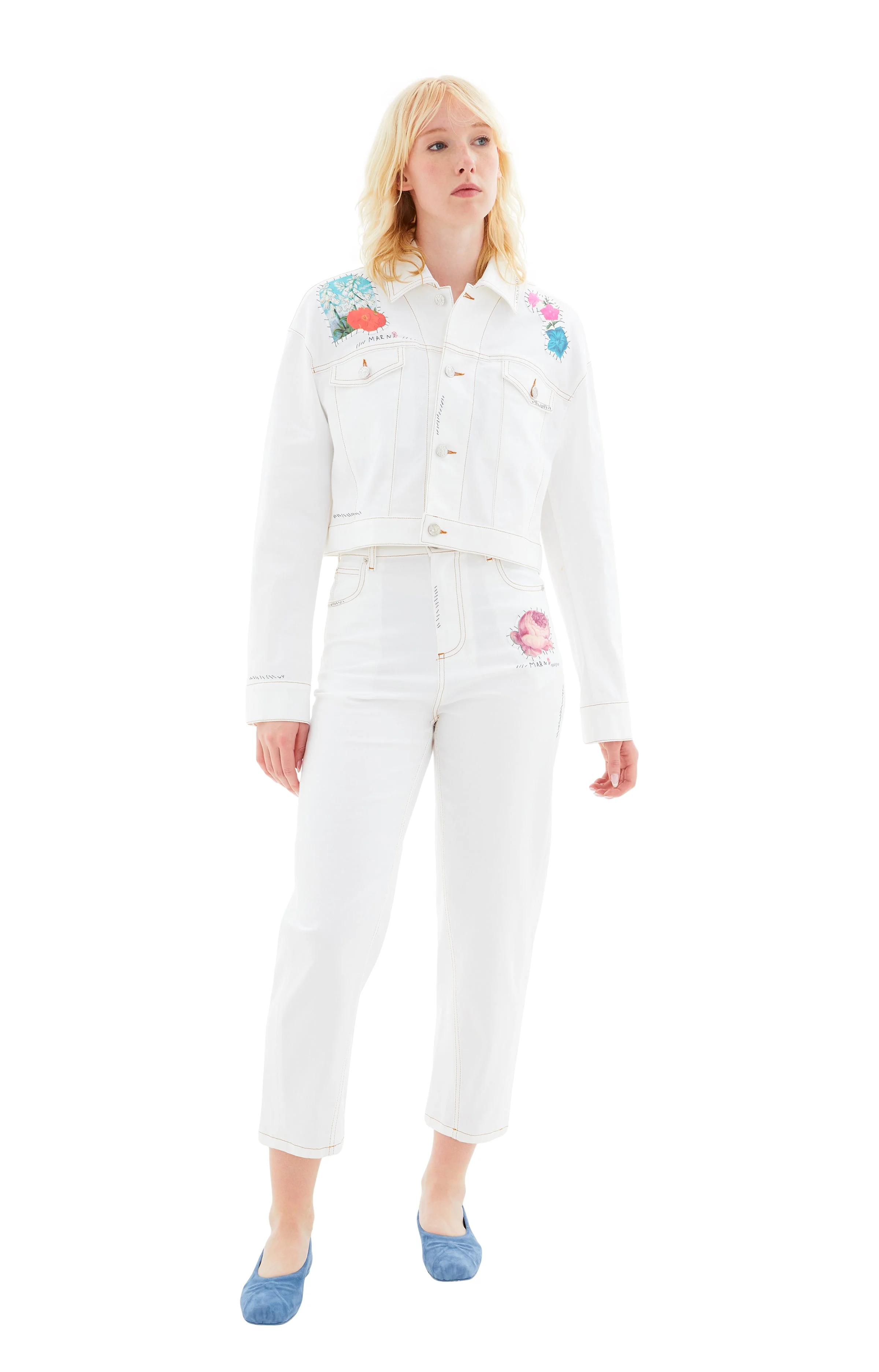 PAJD0470SX/UTC341/00W01 Lightweight stretch cotton denim trousers. Five-pocket style with regular rise and wide leg. Button and fly closure. Hand-stitched Marni mending logo with flower detail. Embellished with a cut-out flower patch, lifted from this season's colourful collage prints. Made in Italy