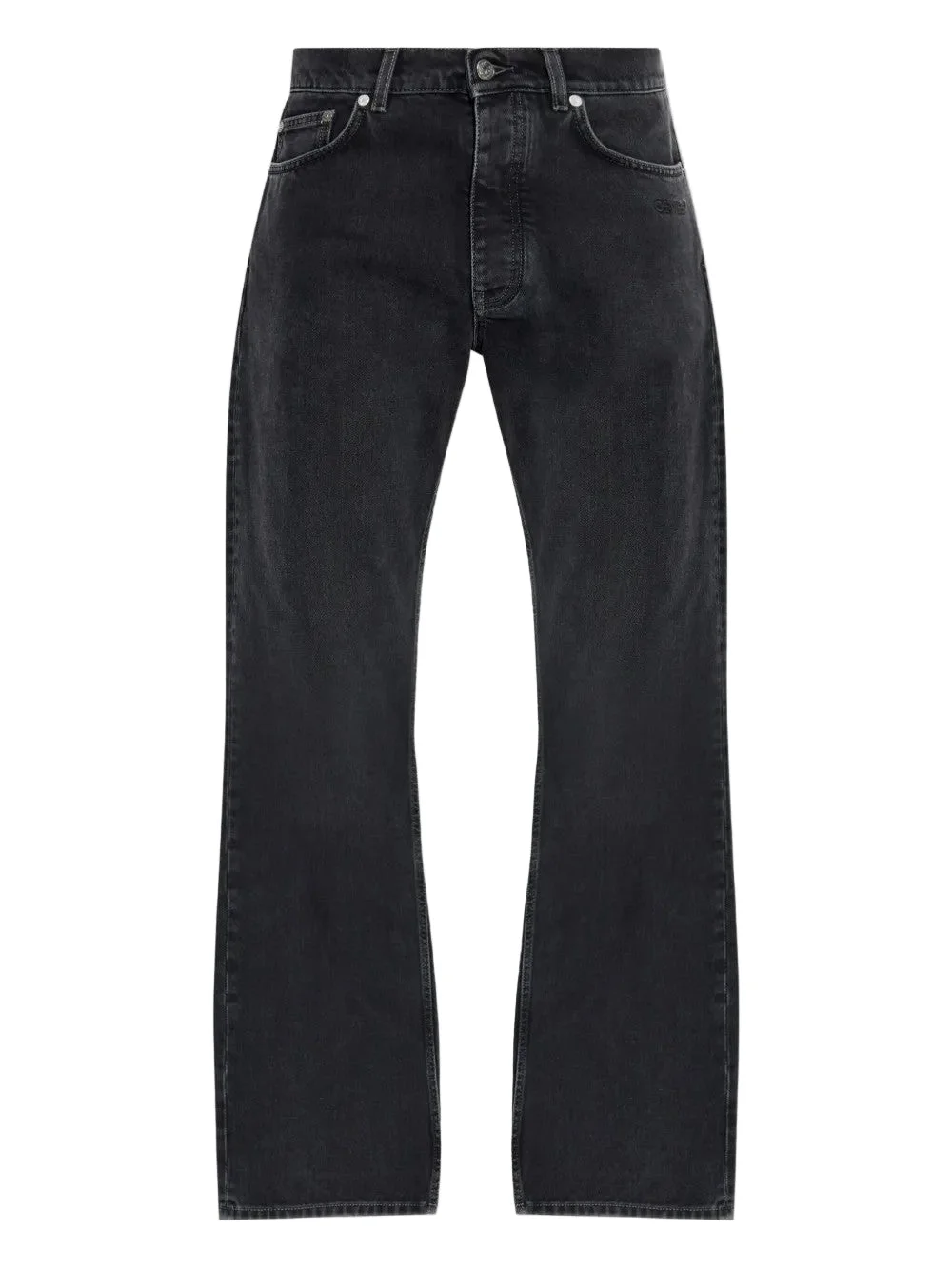 OMYA18WF25DEN0011310 The Off-White Script Logo 90s Skate Jeans in Vintage Black reinterpret classic skate culture through a luxury lens. Crafted in Italy from premium denim, these pants feature a relaxed, wide-leg silhouette with traditional five-pocket styling, belt loops, and a button-and-zip closure. The vintage black wash enhances the 90's-inspired attitude, while subtle branding and expert construction deliver the elevated edge synonymous with Off-White.