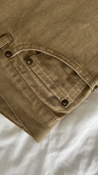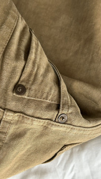 . visvim FLUXUS 12 CHINO 0118205008015 MADE IN JAPAN — fixed price. price negotiations will be ignored — collector. not produced anymore. cotton + linen mix. high end luxurious fabric. tag 2 fits M. HD IMAGES + MEASURES : https://ibb.co/album/CmB8mG — "VISVIM FLUXUS 12 CHINO . 0118205008015 • Fabric: Crafted from a cotton-linen blend (approx. 80% cotton / 20% linen), these chinos deliver enhanced structure with a slight crispness from linen and natural breathability from cotton, creating a luxurious yet practical weave. • Weave & Texture: The chino fabric balances resilience with soft drape. Its finely slubbed surface shows subtle irregularities that lend a textured depth and evolve visually with wear. • Weave Specifics: Likely produced using shuttle looms for a tight, durable finish—classic to the Fluxus aesthetic—this fabric resists deformation while developing character over time. • Cut & Construction: The Fluxus 12 chino leans into a relaxed silhouette with a slightly tapered leg, ample thigh room, and mid-rise fit. It includes a classic 5-pocket layout, button fly, and Visvim’s signature hardware and deerskin leather patch." — cubism inc. .