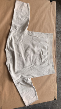 . visvim JUMBO SB SWEAT 3/4 DMGD (U.D.) IVORY MADE IN JAPAN 0124205010017 as new. — fixed price. price negotiations will be ignored. high end item. from last year collection. tag 3 fits M. HD images + fit + measures : https://ibb.co/album/vCFQXv "— The VISVIM JUMBO SB SWEAT 3/4 DMGD (U.D.) is a premium Japanese sweatshirt that merges traditional loopwheel construction with subtle textile engineering and a distinctive artisanal dye finish. Fabric Composition: Crafted from a proprietary blend of 95% cotton and 5% nylon, developed to enhance firmness, abrasion resistance, and long-term shape retention. The nylon is subtly integrated within the fleece knit structure, lending added durability without altering the handfeel of the cotton. Weave & Handle: Knit on vintage loopwheel machines at low tension, the fabric has a dense, spongy body with a naturally dry-touch exterior and soft fleece interior. Dyeing & Aging: The standout feature of this piece is its "damaged" (DMGD) and uneven dye (U.D.) treatment. Each sweatshirt is individually garment-dyed using low-immersion bath methods and then manually finished to create deliberate inconsistencies in tone—ranging from pale ivory highs to tea-stained, sun-faded lows. This mimics the appearance of garments that have aged naturally over decades, with high-wear zones subtly lightened and shadowed areas darkened by tonal accumulation. Silhouette & Construction: Oversized "jumbo" block, with exaggerated dropped shoulders and distinctive 3/4-length sleeves. Traditional crew neckline with a ribbed V-gusset, referencing early athletic wear. Ribbed sleeve cuffs and hem offer subtle contrast and prevent the silhouette from collapsing. Clean-sewn with reinforced seam work, inside and out. —" cubism inc. .