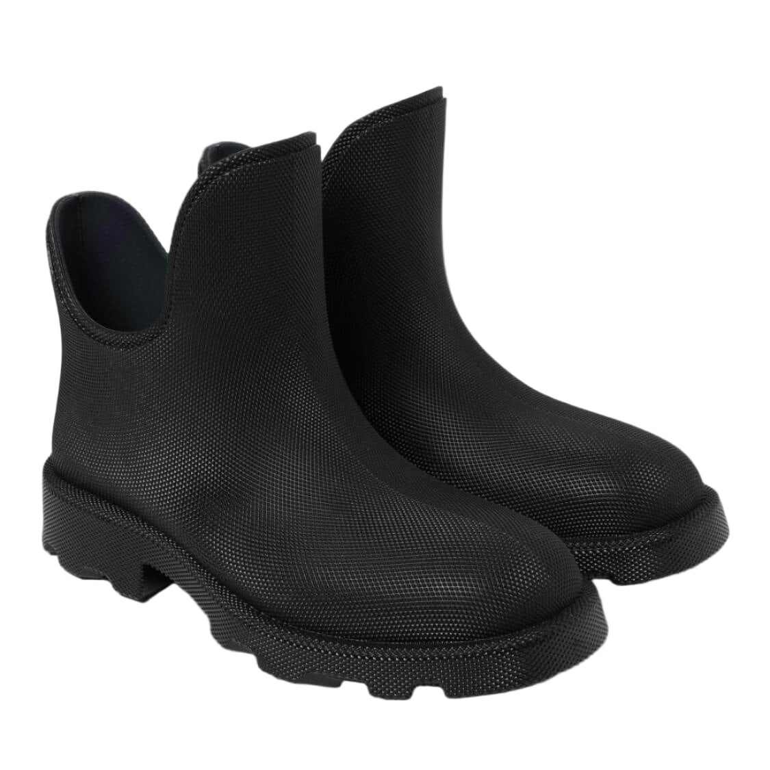 Expertly crafted in Italy by designer BURBERRY, these low-cut rain boots are perfect for keeping your feet dry and stylish. Made of 100% polyurethane rubber with a tank sole and round tip, these ankle boots are durable and functional for any outdoor adventure. Stay fashionable in any weather with the classic black color.