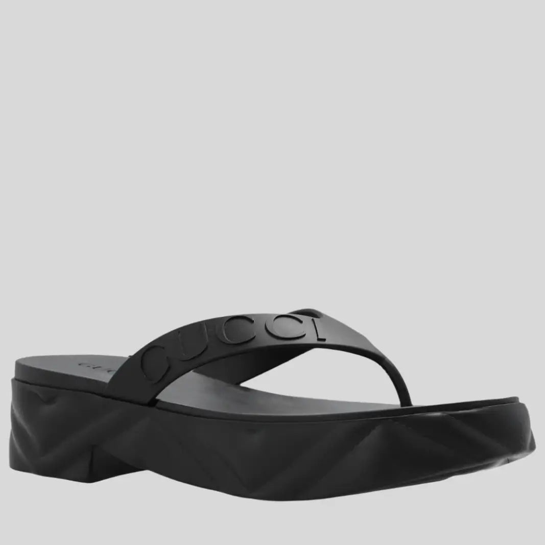 Elevate your style with the playful and retro-inspired Thong Platform Sandal from Gucci. The black rubber adds a vibrant touch, while the Gucci embossed strap exudes elegance. The chevron embossed platform and sole, with a 52mm heel height, create a bold statement. Made in Italy.