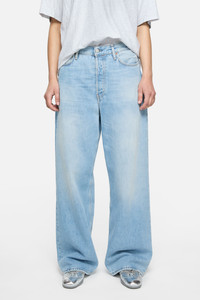 1981M jeans are cut to a baggy fit with a low waist, wide leg and long length. Crafted from non stretch denim in a light blue wash. - Baggy fit - Low waist - Wide leg - Long length - 5-Pocket construction - Button fly - Female model is 180 cm / 5′9" and wears a size Large, Regular, corresponds to a size 40 and denim 30 - Male model is 188 cm / 6'2" and wears a size Small, Regular, corresponds to a size 46 and denim 29 - Style ID: Acne Studios 1981 U Light Blue Vintage - Shell: 100% Organic cotton, Patch: 100% Cow leather