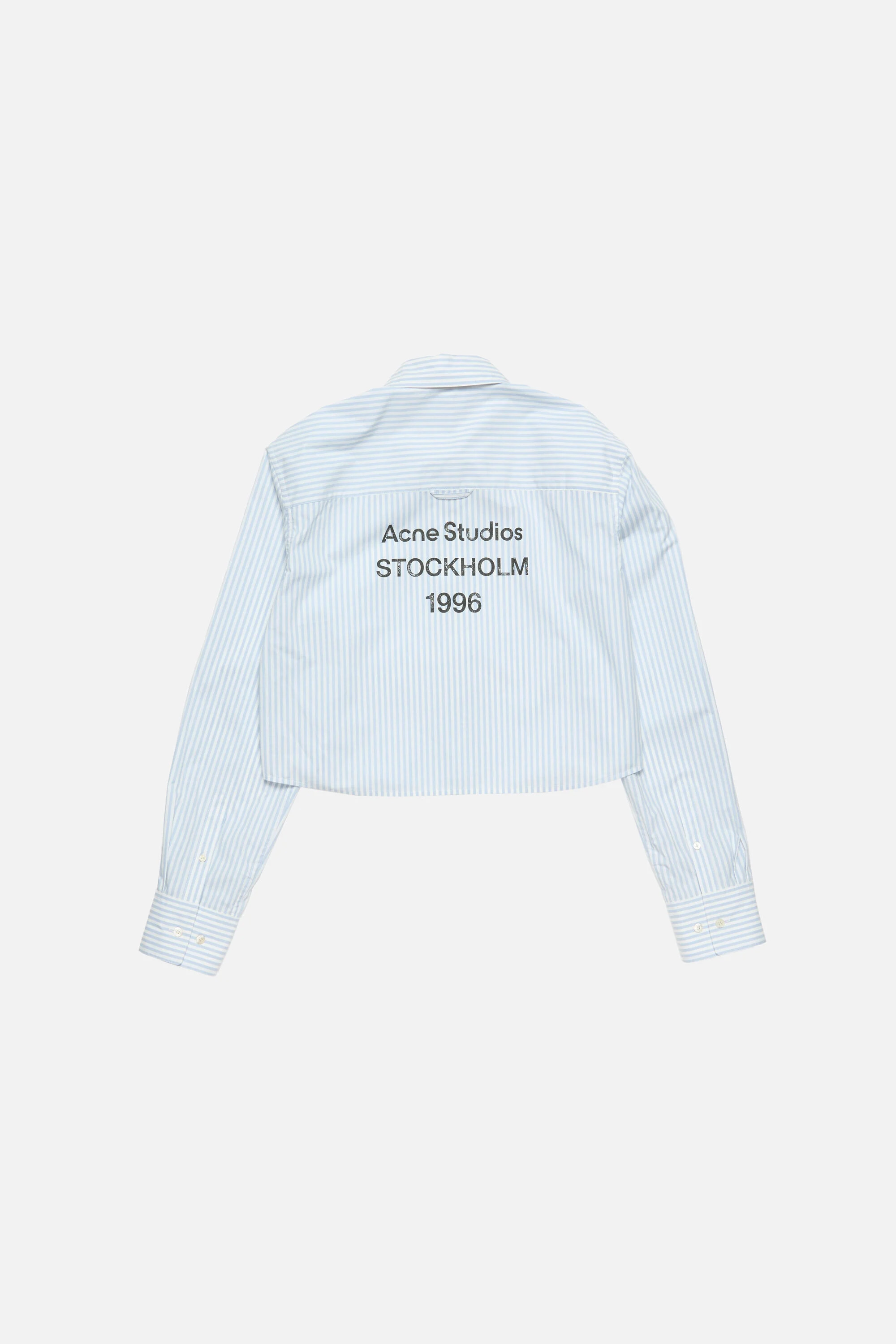 Button-up shirt features a stripe pattern and Acne Studios logo stamp print on the back. Cut to a relaxed fit and cropped length. - Relaxed fit - Below hip length - Button-up closure - Acne Studios Stockholm 1996 logo print - Model is 177 cm / 5'10 and wears a size 36 - Style ID: FN-WN-BLOU001164 - Shell: 100% Organic cotton