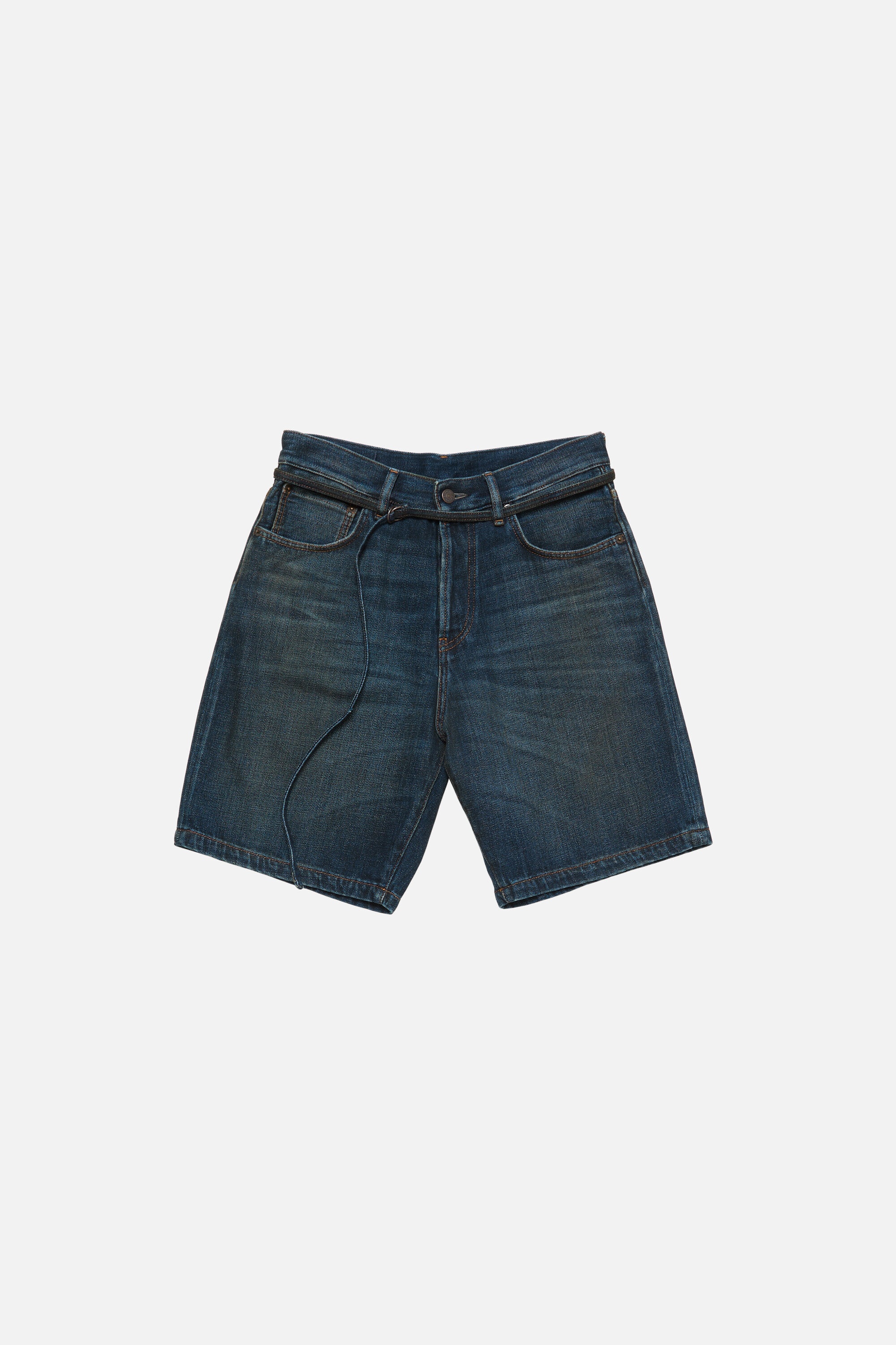 Shorts crafted from indigo denim twill with a dirty tint and natural whiskers. Finished with a belt featuring a D-ring closure. Cut to a loose fit with a mid waist, straight leg, and above-knee length. - Loose fit - Mid waist - Above knee length - Straight leg - 5-pocket - Button fly - Model is 178 cm / 5'9 and wears a size XS - Style ID: FN-UX-SHOR000036 - Shell: 100% Cotton, Patch: 100% Cow leather