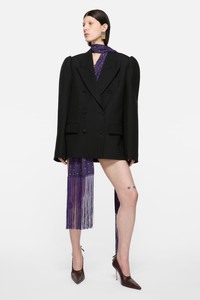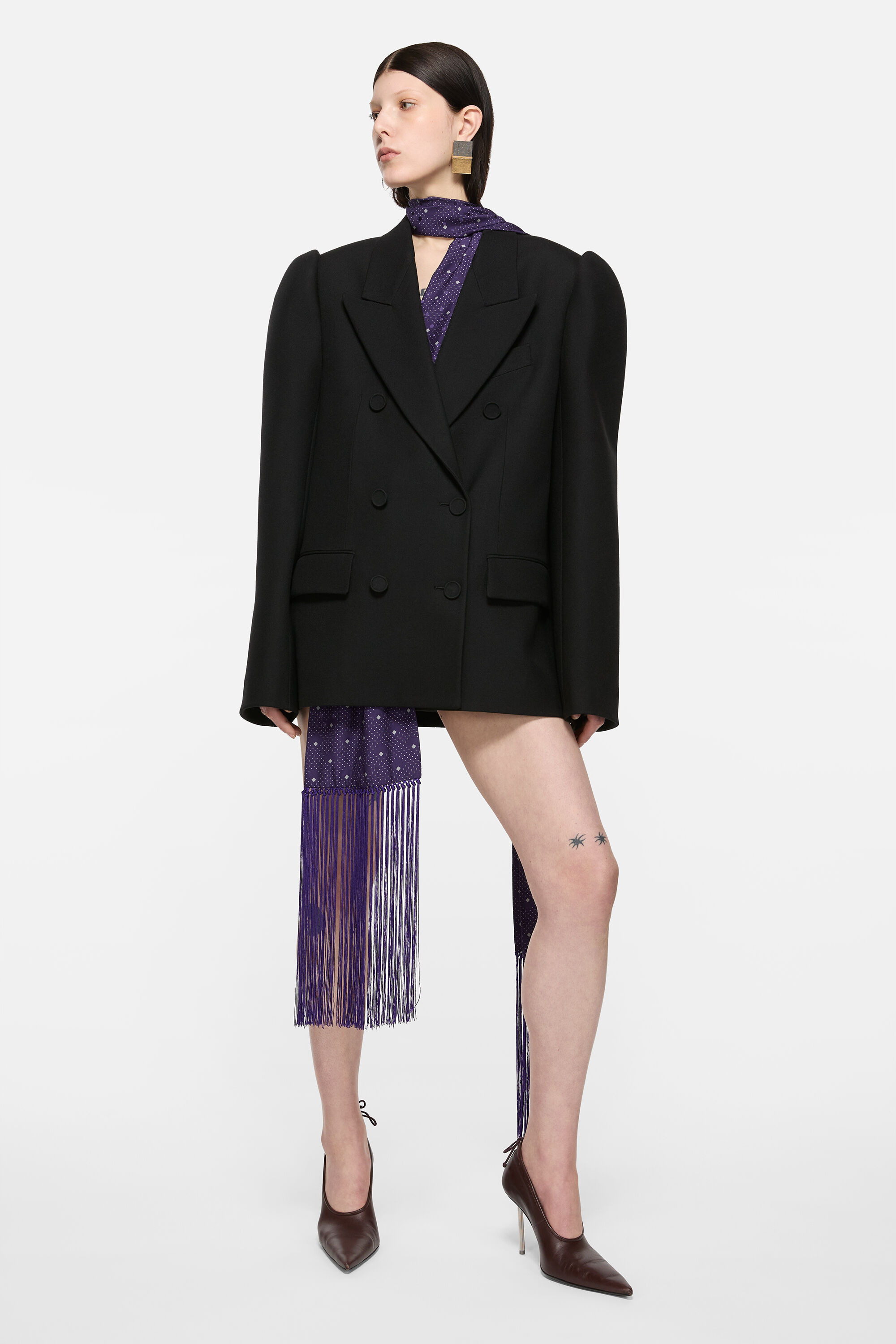 Double-breasted suit jacket crafted from wool with a fluid feel, featuring oversized epaulettes for an exaggerated silhouette. Complete with front flap pockets, a chest welt pocket, and fabric-covered button closure. Cut to a regular fit. - Shell: 100% Wool, Backing: 100% Wool, Lining: 50% Viscose, 50% Acetate