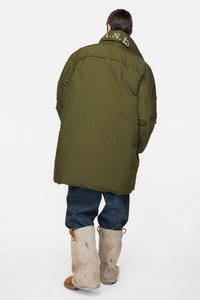 Down jacket crafted from recycled nylon, featuring a raised collar with seasonal print. Designed with a snap button closure, flap front pockets, side seam pockets, and elasticated cuffs. Finished with internal drawcords for adjustability. Cut to a regular fit with relaxed sleeves and a below-knee length. - Regular fit - Below-knee length - Relaxed sleeves - Raised collar with artwork - Front flap pockets - Side seam pockets - Elasticated cuffs - Front snap button closure - Fully lined - Model is 187 cm / 6'1 and wears a size 46 - Style ID: FN-MN-OUTW001190 - Made with organically grown cotton and recycled nylon - Filling made from recycled down and recycled feathers - Shell: 48% Nylon, 52% Cotton, Lining: 100% Viscose, Filling: 90% Duck down, 10% Duck feathers
