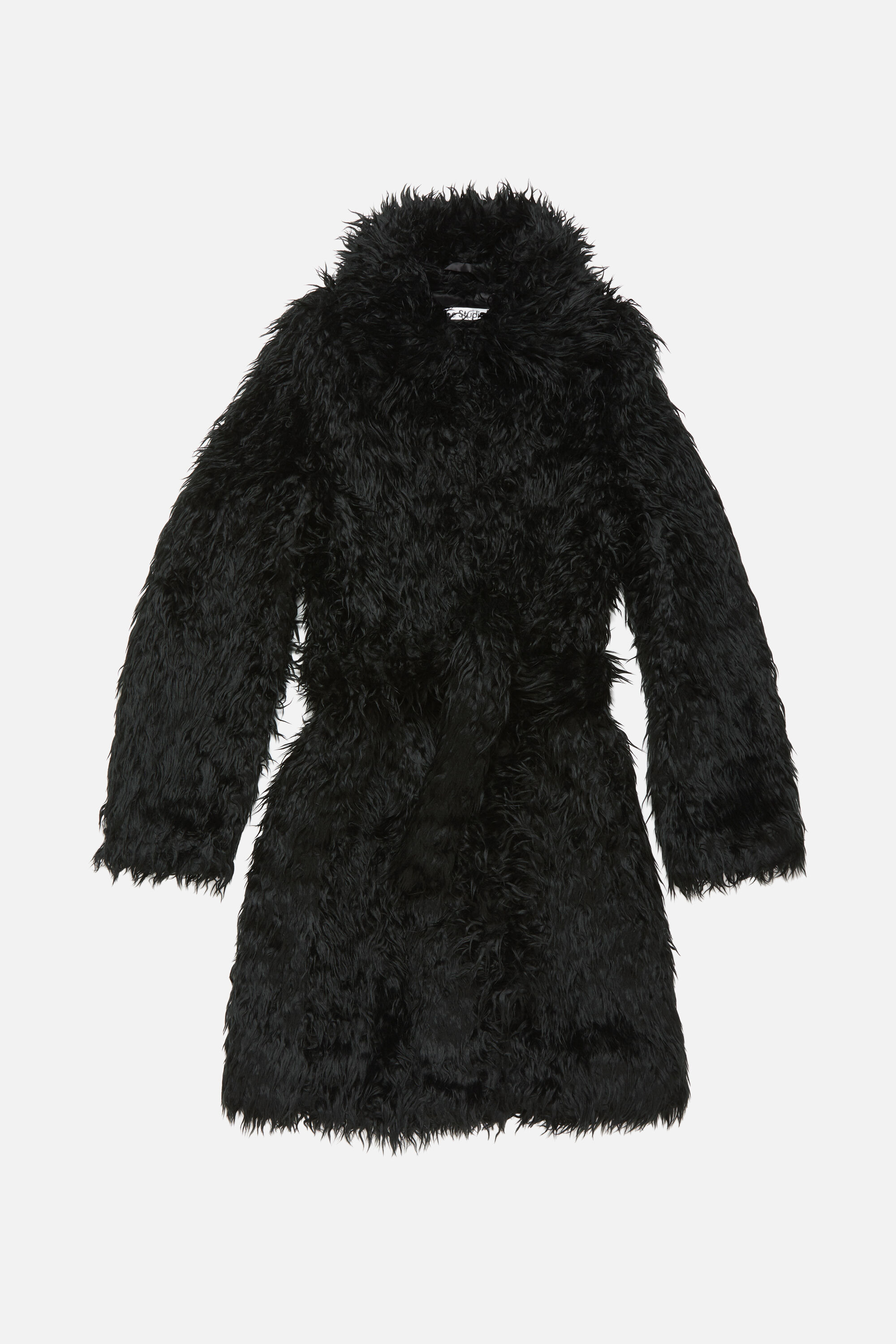 Coat with belt crafted from faux fur with a "messy" medium pile and soft handfeel. Designed with shoulder pads, hidden hook-and-eye closure, side seam pockets, and a metal logo plaque at the back neckline. Fully lined with black logo print. Cut to a regular fit with relaxed sleeves and mid-calf length. - Regular fit - Mid-calf length - Relaxed sleeves - Belt - Shoulder pads - Side seam pockets - Metal logo plaque - Hidden hook-and-eye closure - Fully lined with black logo print - Model is 178 cm / 5'8 and wears a size 36 - Style ID: FN-WN-OUTW001064 - Made in Italy - Shell: 80% Acrylic, 20% Polyester, Lining: 50% Viscose, 50% Acetate