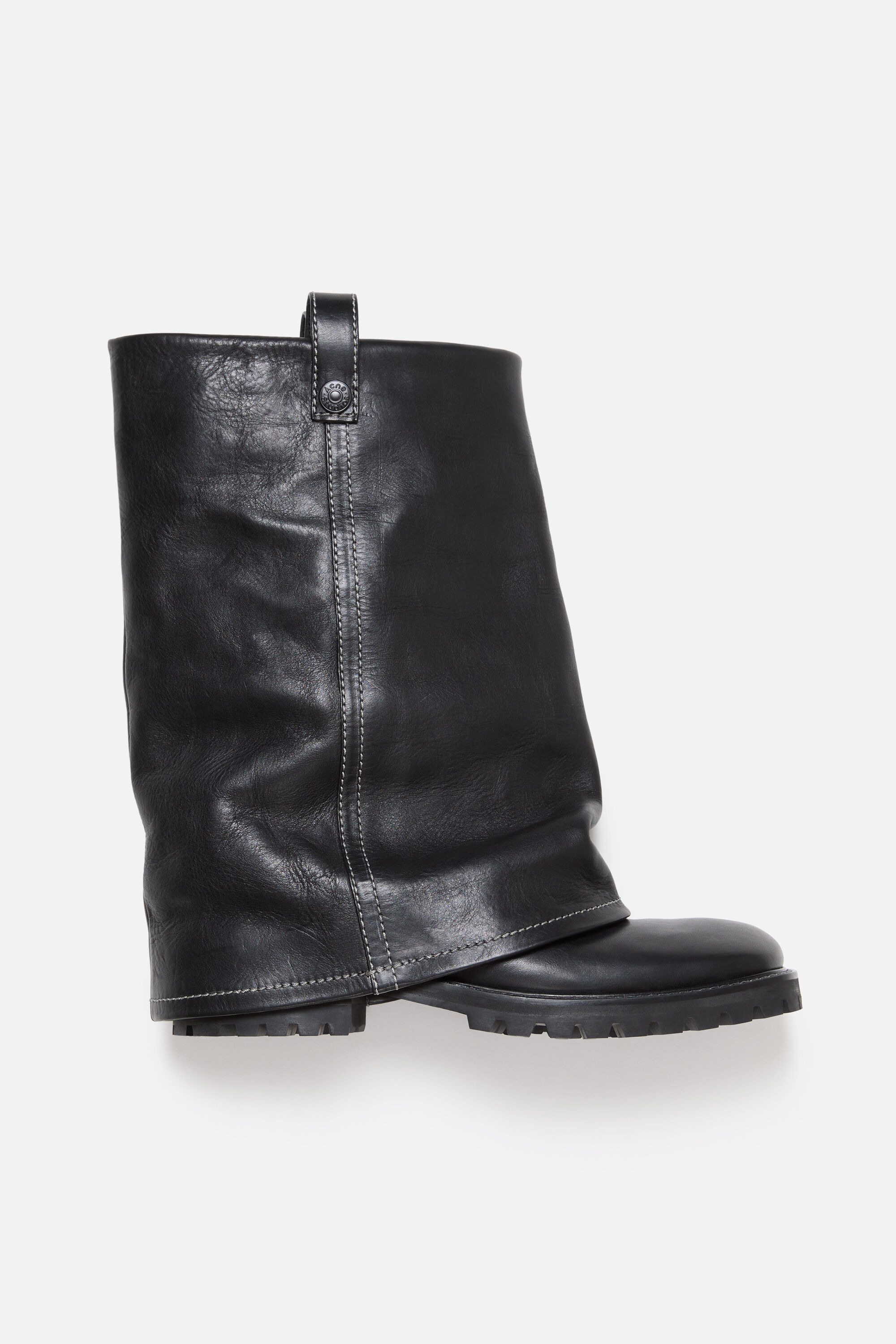 A mid boot featuring branded soles and denim-inspired detailing. Crafted from calf leather with a durable rubber sole, the design is defined by a folded leather shaft and finished with a vintage effect and contrast stitching. - Mid-calf boot - Folded shaft - Branded rubber soles - Heel height: 50mm - Sole height: 25mm - Style ID: FN-MN-SHOE000311 - Made in Italy - Uppers: 100% Calf leather, Lining: 100% Calf leather, Soles: 100% Rubber