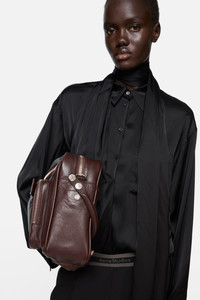 Button-up shirt blouse crafted from lightweight, fluid satin fabric, featuring constructed scarf detailing. Cut to a relaxed fit and hip length. - Relaxed fit - Constructed scarf detail - Fluid satin fabric - Hip length - Button-up closure - Model is 179 cm / 5'11" and wears a size 36 - Style ID: FN-WN-BLOU001206 - Shell: 51% Viscose, 46% Preferred viscose, 3% Elastane