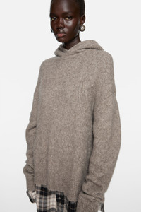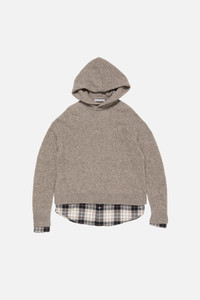 Hooded knit sweater with a layered construction, crafted from soft, mid-weight yak-blend yarn with a minimalist finish. Features woven flannel shirting details at the hem and cuffs. Designed with dropped shoulders and cut to a relaxed fit with a below-hip length. - Relaxed fit - Below-hip length - Hooded - Flannel shirting details - Model is 179 cm / 5'9 and wears a size S - Style ID: FN-WN-KNIT000891 - Shell: 31% Yak wool, 22% Nylon, 16% Wool, 31% Alpaca, Contrast: 100% Cotton