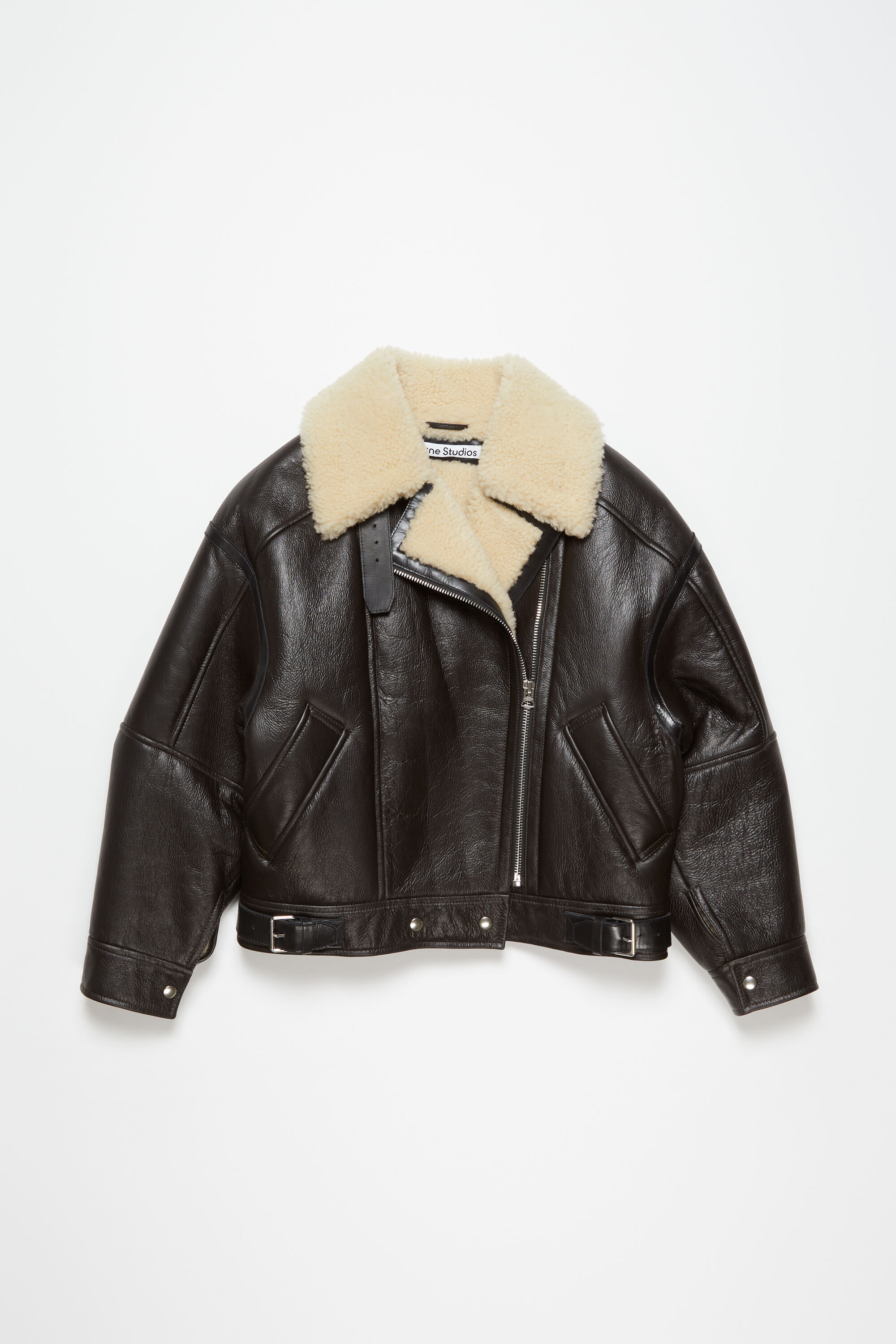 Double-breasted jacket features a contrast shearling neckline with an adjustable strap, with a zipper closure. Crafted from leather and lamb shearling. Detailed with adjustable straps at the neck and hem. Cut to a relaxed fit and a hip length. - Relaxed fit - Hip length - This item runs large, we recommend choosing a size down - Double-breasted - Zipper closure - Neckline adjustable straps - Welt front pockets - Button detail at cuff and hem - Model is 178cm/ 5'10 and wears a size 36 - Style ID: FN-WN-LEAT000125 - Main material: 100% Lamb shearling, Lining: 100% Cotton