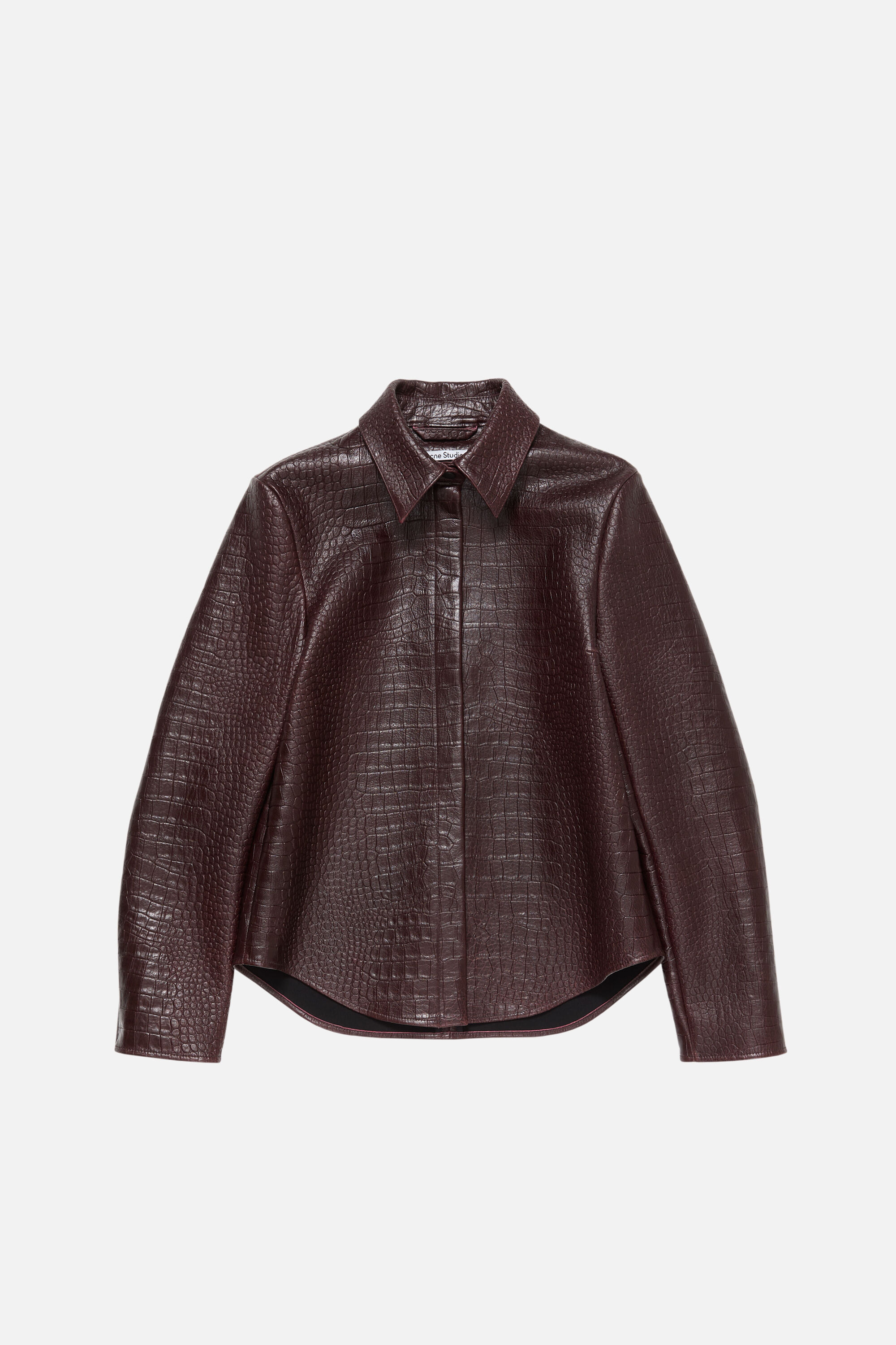 Shirt jacket crafted from full-grain leather with an embossed snake print. Features a center front invisible snap button closure and a leather tab at the back neckline. Cut to a regular fit and hip length. - Regular fit - Hip length - Invisible snap button closure - Leather logo tab - Model is 178 cm / 5'8 wears size 36 - Style ID: FN-WN-LEAT000439 - Shell: 100% Lamb leather, Backing: 95% Polyester, 5% Elastane