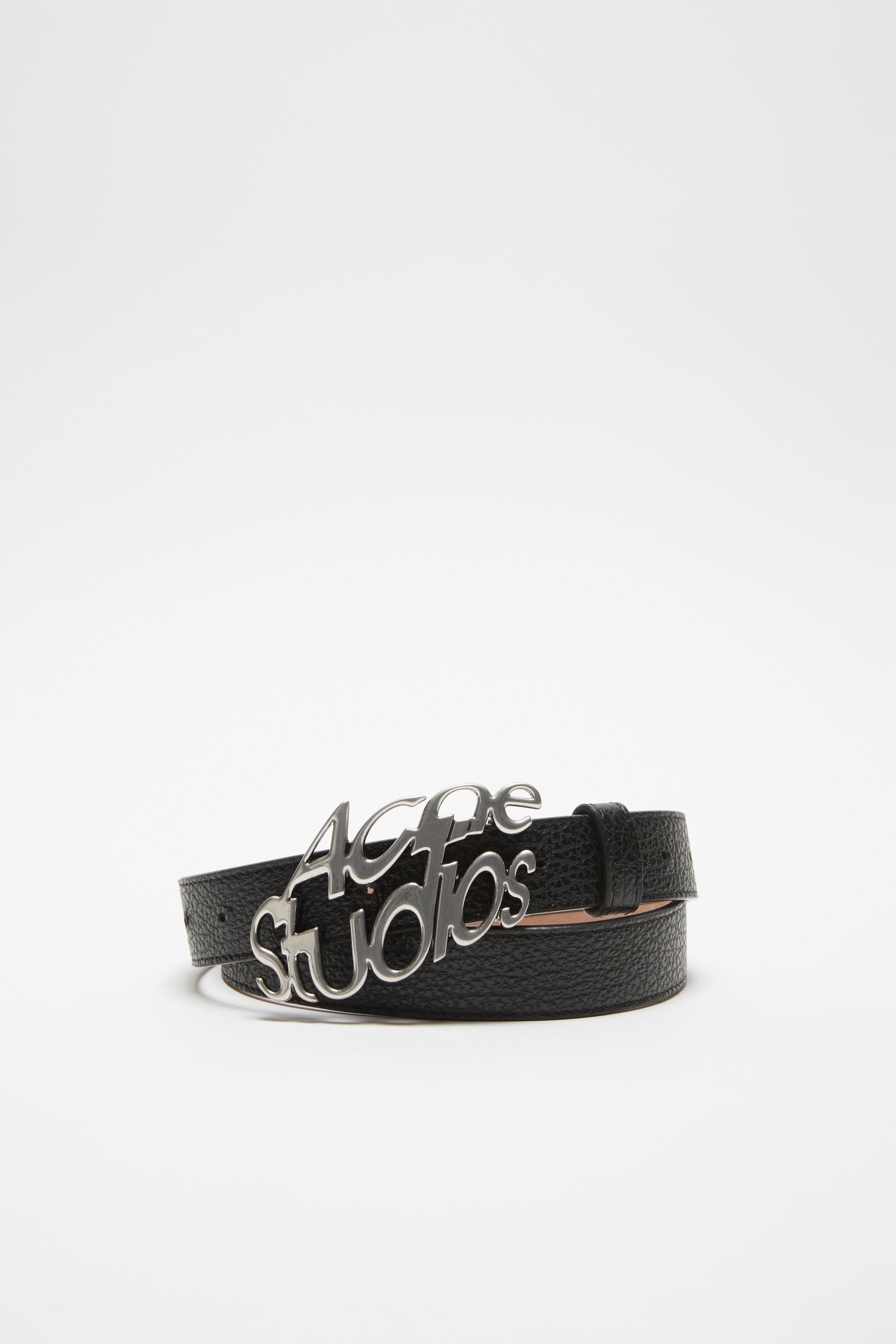 Buckle belt features a seasonal fish-eye Acne Studios logo in antique silver-toned metal and grained leather. - Acne Studios fish-eye logo - Silver-toned metal buckle - Size S measurements: 100 cm; 2,5 cm - Size M measurements: 110 cm; 2,5 cm - Size L measurements: 120 cm; 2,5 cm - Style ID: FN-UX-ACCS000136 - Shell: 100% Preferred calf leather, Lining: 100% Calf leather