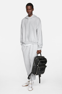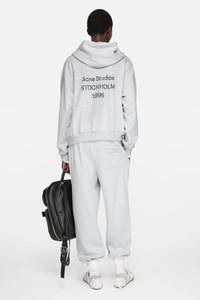 Hooded sweater is cut to a relaxed unisex fit with dropped shoulders and below-hip length. Detailed with an Acne Studios logo stamp print at the back, crafted from a fleece cotton blend with a vintage sprayed effect. - Relaxed unisex fit - Dropped shoulders - Below hip length - Hooded - Sprayed finish - Logo at the back Acne Studios 1996 - Distressed details at the cuffs and hem - Female model is 176 cm / 5′10 and wears a size XS - Male model is 188.5 cm / 6′2 and wears a size M - Style ID: FN-UX-SWEA000023 - Made with organically grown cotton and recycled polyester. - Shell: 89% Organic cotton, 11% Recycled polyester